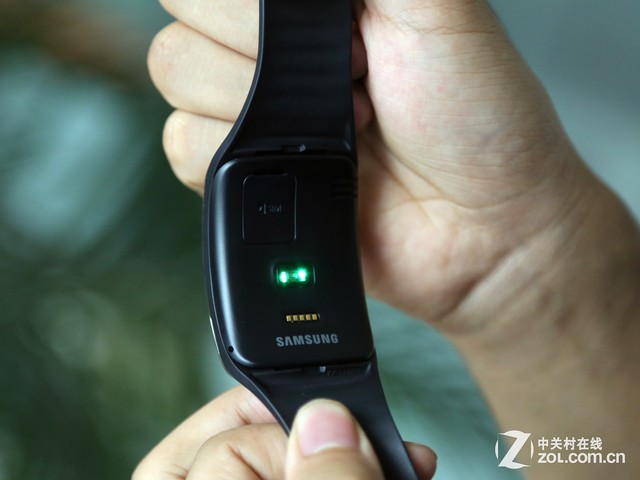表盘背面采用塑料材质设计,从上至下一次排布有SIM卡槽、扬声器、光学心率传感器以及按压式充电接触点。心率传感器在测试时会发出绿光,从上一代智能手表三星就采用了这样的设计,这也是目前智能手表品牌普遍采用的原理。