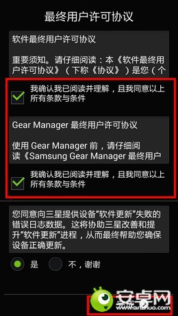 4.点击手机上的【确定】按钮,并且点击Gear上的【对钩】