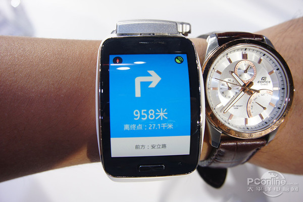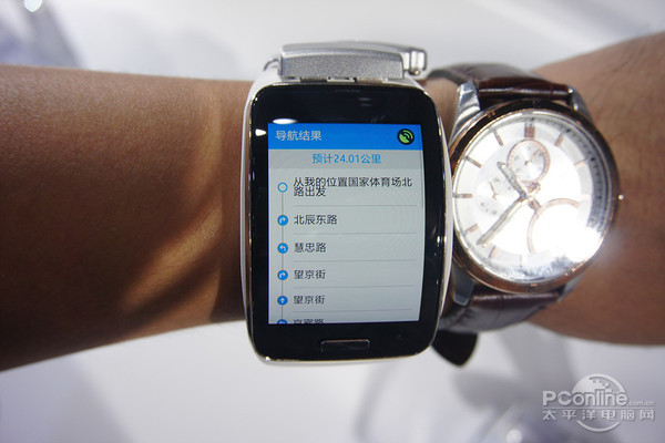 导航作为智能穿戴设备一个很有前途的功能,apple watch在其发布会上也做了单独的功能演示,那么Gear S的导航效果如何?从其导航界面来看,提示信息清楚,获取路线的速度也很快,相当不错。