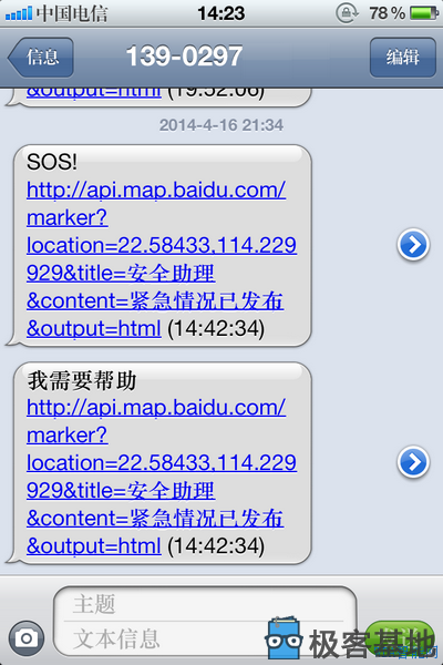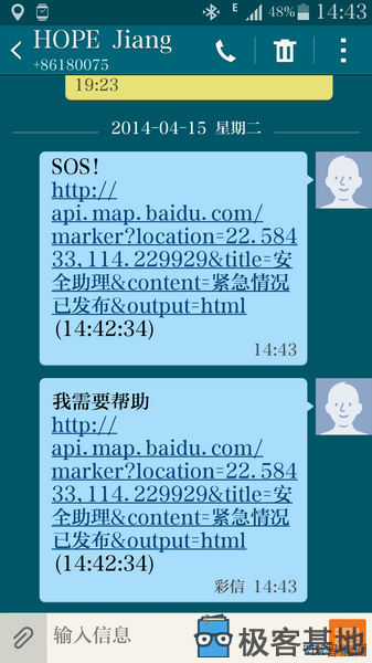 点击打开上面的链接,地图上会显示发送当时的位置。以上是在发送手机上的信息,而不是预先设定的联系人手机收到的信息。
