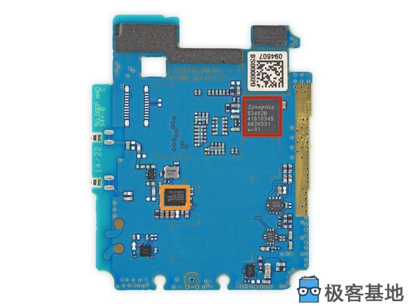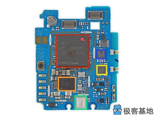 红:高通APQ8026系统芯片在SK Hynix H9TU32A4GDMC 512 MB DRAM(动态随机存取存储器)的底下。