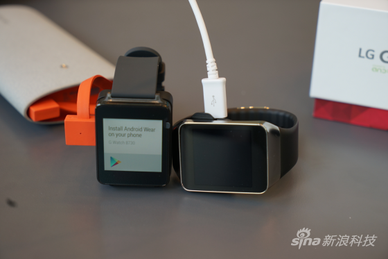 充电中的LG G Watch(左)与三星Gear Live(右)