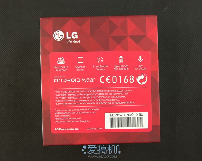 背部采用红色的暗格纹路,上面标注了G Watch的一些特性,具有IP67防水防尘标准,9轴动作传感器,400mAh电池等▼
