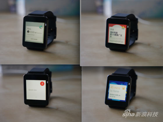 Android Wear智能手表本质上还是Android智能手机的一个伴侣。Android手机上出现的各种信息,都会以条状出现在智能手表的屏幕上,例如天气、短信、提醒、导航、微博、微信、邮件等诸多信息卡。和Google Now卡片一样,手指向右滑屏就可以删除卡片。等到信息再次相关时,这些卡片又会重新出现在手表上。
