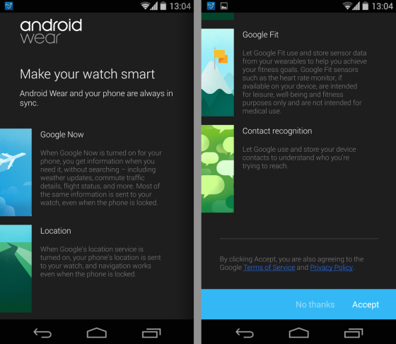 配对成功后,按照android wear应用的向导,打开通知推送直手表,打开自动搜索地理位置,打开google now。