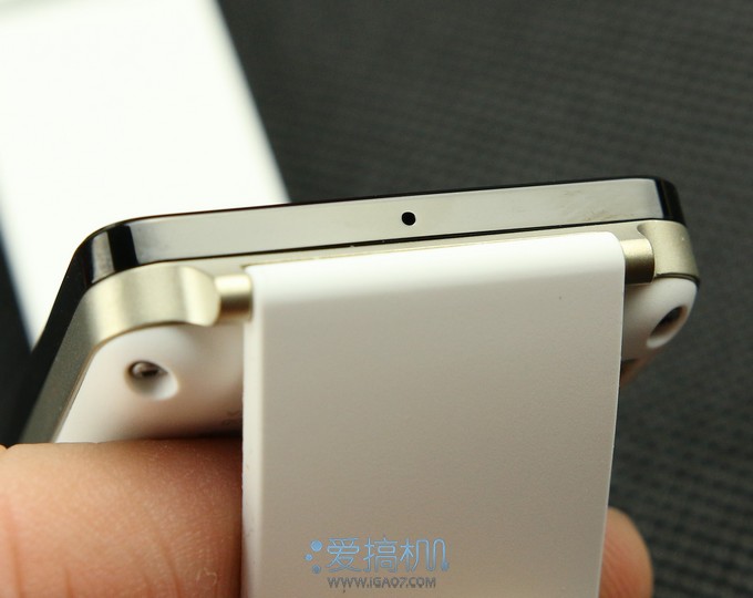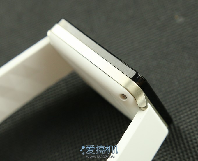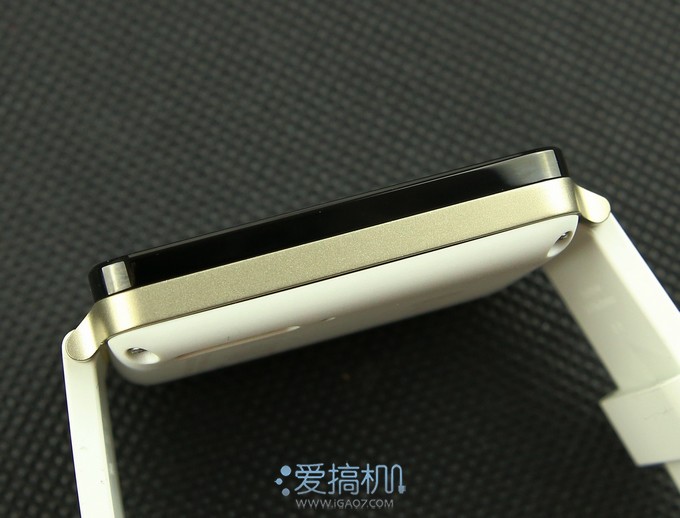 从侧面看G Watch采用了“三明治”的外观设计,中间是金属的金色中框▼