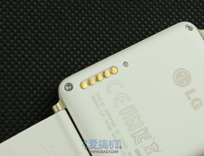 手表本身没有Micro USB插口,表盘背后有5个金属触点,还有一个重置针孔(用针顶入这个孔保持8秒,就可以重置手表)。LG通过附带的一个充电壳以磁力吸附在表盘上,然后通过这个充电壳上的Micro USB插口进行充电。这个处理或许有利于防水,但也增加了一个附件。