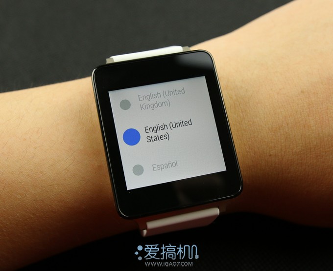 启动G Watch,手表上没有任何物理按键,所有操作都需要依靠触摸屏,内置多国语言,但是并没有中文▼