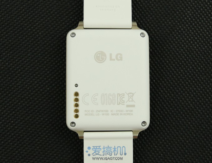 手表底部也是采用了白色的磨砂表面,左下角有金属触点和重启按钮。G Watch型号是W100,韩国制造▼