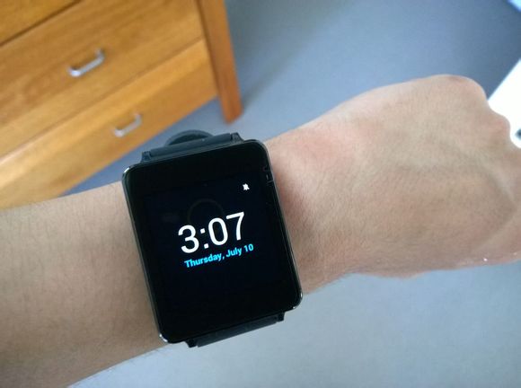 用户可以选择保持屏幕常亮,也可以省电选择关闭屏幕。用户在翻手抬起看表的时候,LG G Watch会自动亮起屏幕,以便用户查看时间以及未读信息。而关闭屏幕也很简单,用手掌轻轻盖住表面就可以。在接到未读信息后,LG G Watch手表会轻轻震动提醒用户。这块手表是没有扬声器的,所以震动就是唯一的提醒手段。