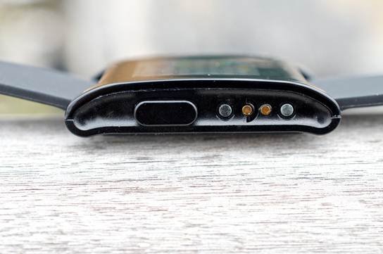 Pebble整体的设计理念以低调为主。在体型上它明显要比以前的智能手表纤薄了很多,它戴在手上毫无负重感。我们评测用到的是黑色版本的Pebble,当背光灯熄灭时,表盘区域与其他区域浑然一体。在它的两侧你可以发现它的按钮,右侧上/下键和选择键,而左侧则是返回键和磁力充电接口,这样的充电接口设计可以在不添加额外保护壳的前提下保证Pebble的防水性,非常聪明的小细节。