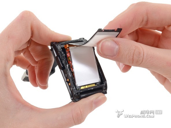 - 剥开电子纸屏幕膜,背光 LED 就出现在眼前了,Pebble 的屏幕仅使用 3 个 LED 灯。