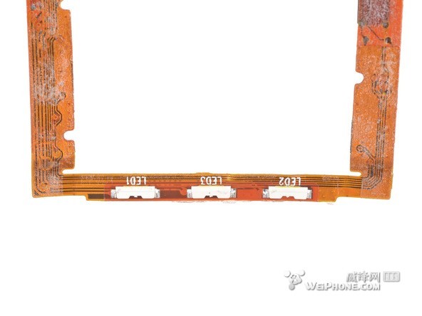 - 带状线缆移除后我们可以看到摁键和蓝牙天线,而另一面则有背光 LED。
