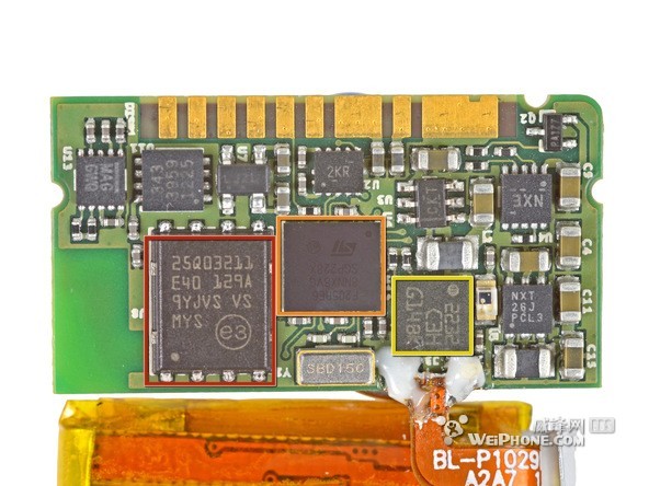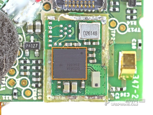 - 在一些脱焊工作之后,卸下模块防护罩,我们发现下面竟然还有德州仪器 CC2560A 蓝牙控制器,但是它好像不支持 BLE(蓝牙低功耗功能),不过在未来的固件升级之后,它也将支持 BLE。