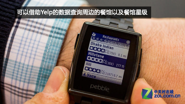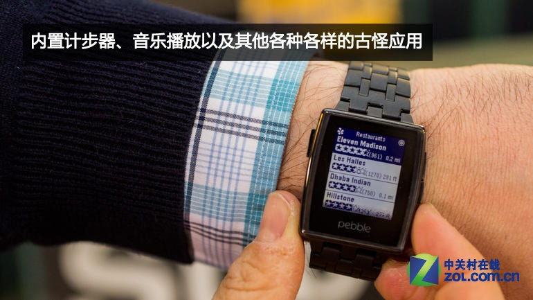 Pebble应用商店当中包含着不少来自于独立开发者的应用程序,笔者尝试了Foursquare、Yelp和ESPN,结果有好有坏。在手腕上查看Foursquare绝对未来感十足,但频繁的按键操作和低分辨率的黑白显示屏又把我们带回到了过去。我想不出为什么要使用Pebble而不是手机来在Yelp上查找一家酒吧,而ESPN虽然能带来比赛得分,但在手腕上点来点去实在是件麻烦事。
