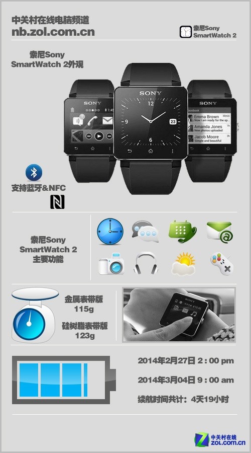 从上面的大图中我们其实可以了解到SmartWatch 2的一些基本信息,这款智能手表支持蓝牙与NFC连接模式,主要功能包括时间、天气信息的显示,短信、微博、邮件的接收,虽然自身没有摄像头和麦克风,但是能够控制手机接打电话、拍照、听音乐,同时还拥有一些益智类的小游戏。