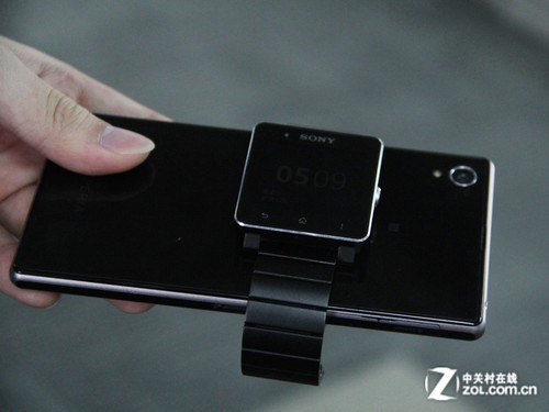 SmartWatch 2支持蓝牙与NFC连接模式,用户可以通过打开蓝牙之后进行配对连接,当然也可以像下图一样将手表背部与支持NFC功能的手机背部相接触,这样手机就可以自动识别到SmartWatch 2了。