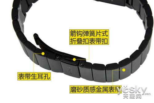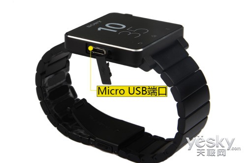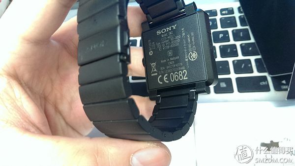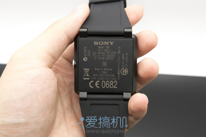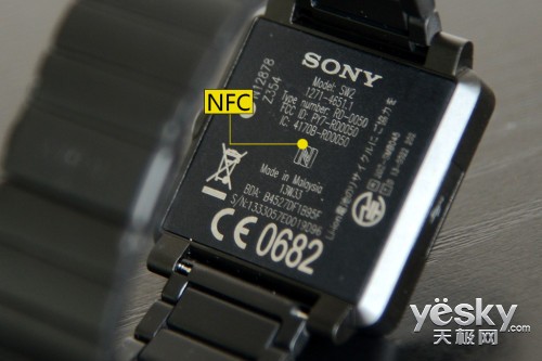 表身背部聚集了产品所有的标识和信息,同时NFC芯片的位置也在此。通过NFC,我们可以很方便的使SmartWatch 2与索尼智能手机进行连接,实现一触即连。