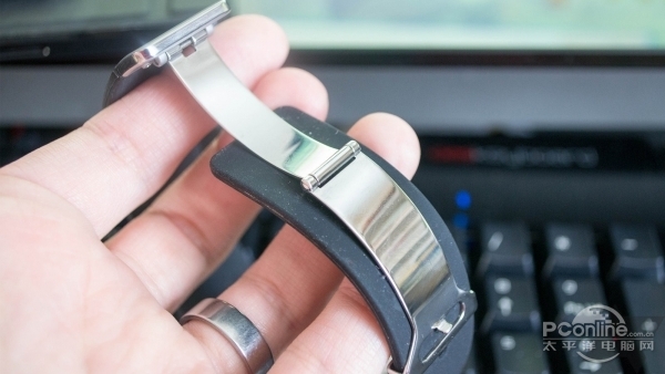 我们首先留意到的是它的表带非常特别,居然延伸包裹了整个显示屏的四周。表带与去年SmartWatch 2的表带一脉相承,但这不是件好事情,因为橡胶材料上手感觉有点廉价。阳春白雪的流水线屏幕,再配上个下里巴人的表带,让人感觉SmartWatch 3更像是健身追踪表,而不是一只优雅的智能手表。