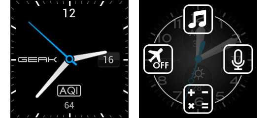 首先让我们熟悉一下GEAK Watch基本的操作方法,之前我们已经介绍到,手表只提供了2个功能按键,上方的按键为快捷功能按键,下方为电源键和返回键的复合功能键。长按下方按键后就可开启或关闭手表,按下则起到返回后退菜单的作用;上方快捷功能按钮会呼出手表的四个快捷功能,分别为音乐播放器、飞行模式、语音录音和计算器。在目前的固件版本中,我们暂时无法更改这四项快捷功能。