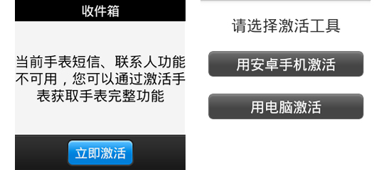 进入手表的收件箱功能,选择激活功能,手表会提示选择电脑或者手机进行激活。我们选择使用安卓手机激活后,手表显示了一张二维码图片,利用我们手上的手机扫描二维码后即可进入应用下载。安装完成后,手机将提示与手表进行连接,打开手机和手表的蓝牙功能后就可快速建立连接。