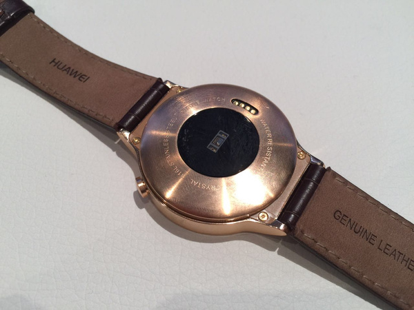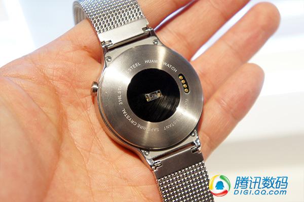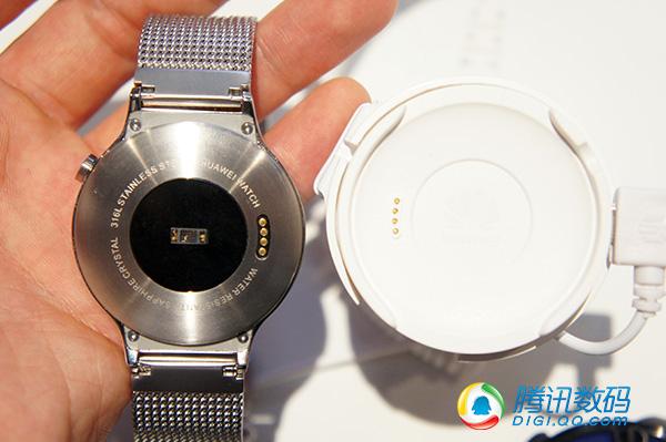 心率模块的附近是华为Watch的充电触点,华为表示采用这样的设计是考虑到手表的厚度以及充电的稳定性。同时也透露该款手表的续航为2天时间。