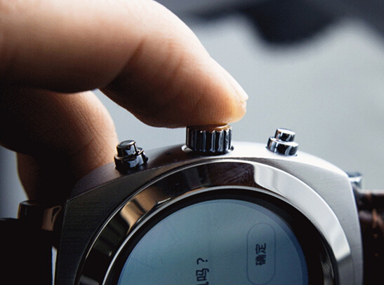 果壳智能圆表在表冠设置方面,按照目前较为流行的多按钮表冠设计。该表设置了三个按钮,请大家注意这三个均为按钮,非可拔出拧动的调时表冠。从左到右依次为设置键(实则是查看当前蓝牙、电量、WLAN、日期状态按钮)、Home/电源键(长按可以开关机)、麦克风孔(Pro版本具有果壳语音助手)、返回键(回到上一页面)。这几个按键的设计与我们日常使用的手机的日常使用习惯差不多,所以对于这款智能手表不用了解过多就能轻松上手。在三个按钮中,中间按键为Home/电源键。