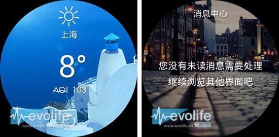 表盘主界面往下滑是天气,往上滑是短消息,这是平时用得最多的两个功能
