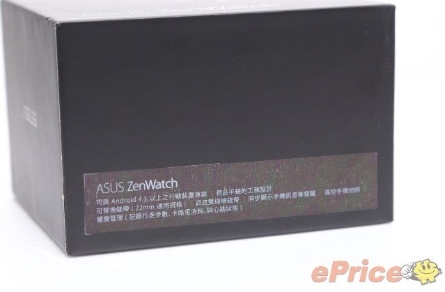 ▲盒装侧面有简单的说明,主要介绍一些 ZenWatch 的特色,像是可与 Android 4.3 以上智能设备配对、可显示各式通知信息,以及可透过手表来摇控手机拍照等等。
