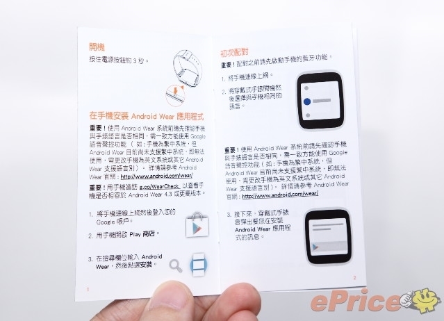 ▲虽然 Android Wear 目前依然没有中文界面,但基本的使用方法可以从附赠的中文说明书快速了解。