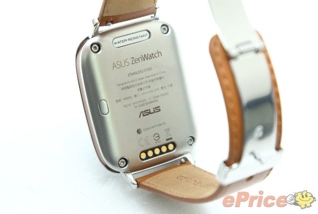 另外,翻到手表背面也能看到一排金属接点,这代表 ZenWatch 无法透过一般的 microUSB 连接口充电,而是必须装上专属的充电背盖。虽然说因为 ZenWatch 电池容量不大 (368 mAh),一般充电大多可在一小时内完成,但要扣上充电背盖才能充电还是有一点麻烦,若是能采用无线充电设计,只要摆在无线充电盘上就能充电就太好了。