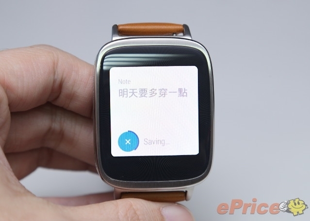 ▲若是你想记下一个待办事项,可以对著 ZenWatch 说出「Take a Note」指令,接著就能用中文说出你想记下来的事项。其它还有许多英文语音指令可使用,而这些指令都能在手表上找到,只要你照著念就能启动相对应的功能。