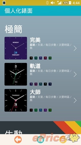 若是要自订表面,首先要点选 ZenWatch Manager 里面的「表面」选项,接著你就能在「极简」、「生动」、「精确」、「即时」等四个类别当中,任意选择喜欢的表面款式去编辑。但可以编辑的选项会依据你选择的表面款式而有所不同,最基本的表面除了可选择表面的颜色样式,还能显示在手表上的资讯,像是天气、第二时区、每日步数之类的;至于稍微进阶一点的表面,除了可编辑颜色,还能同时显示三种资讯,至于要选择哪三样资讯来显示就要由你自己去决定了。