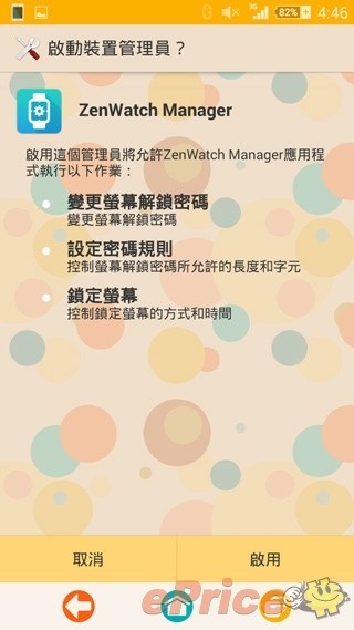 ▲解锁手机功能必须经过几个设定步骤才可启用,首先是必须把 ZenWatch Manager 设定成装置管理员,然后必须设定四位数字的 PIN 码。