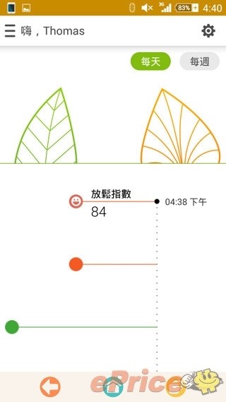 ▲还可以从心率侦测器的测量数据,显示出你的放松指数 (据说数字越低代表你越紧张)。