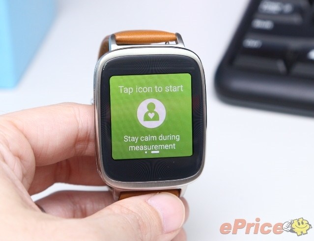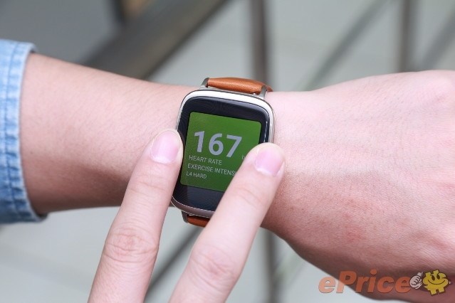 ▲ZenWatch 和其他智能手表不同,它的心率感应器是设置在手表的表框上,测量心率时必须把手指放如上图这样放在边框上。但这样的设计的缺点,就是一定要把手指放在特定位置才能测量心率,没办法全时不间断的侦测心率数据。