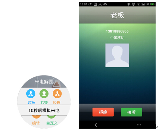 4. 打开手表端来电解围应用,点击相应图标,10s后手机端将会有来电,切记不要快速随便点击哦