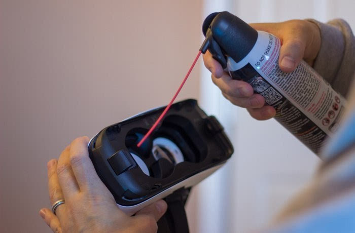 在玩之前,我们会拿上空气罐往镜片两边和手机屏幕吹气,这样基本能把灰尘吹走。或者如果你喜欢头晕的感觉,你的肺部也能帮你达到同样的效果。