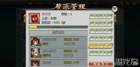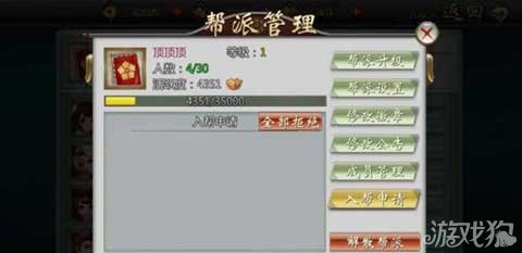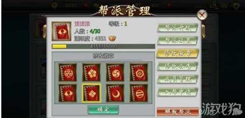 在这里可查看帮派目前的等级、人数、活跃度的具体信息,并进行帮派的升级,帮派升级必须由会长操作才可以进行,其他成员包括副会长没有权限。(如上图所示)