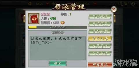 这个是修改帮派公告的界面,在这里写上帮派的宣言或信息,内容会呈现在帮派列表信息中!(如上图所示)