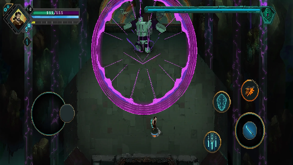 5、面对巨型机械Boss战,角色在紫色魔法阵内闪避攻击,右侧技能栏准备剑技与防御招式应对强敌。