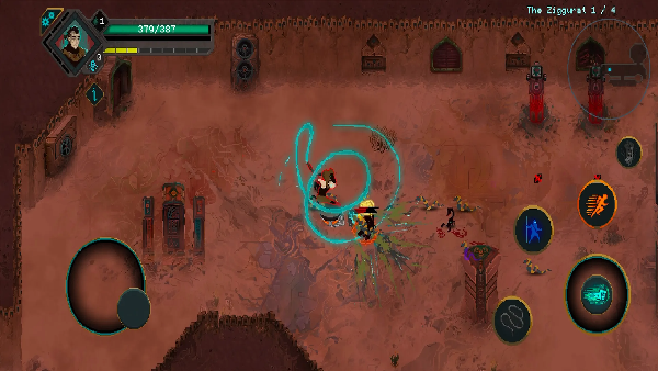 6、在金字塔场景对抗蛇形敌人,角色挥舞光刃造成范围伤害,右上角标注区域名称“The Ziggurat 1/4”。