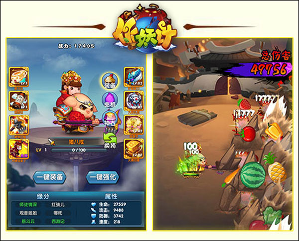 (1)猪八戒,原是天上的天蓬元帅,后因调戏玉帝小三被逐出天庭,投错猪胎。拥有的技能为“一耙定三餐”,此技能放出,蹦出各式水果,凸显了角色的特性。