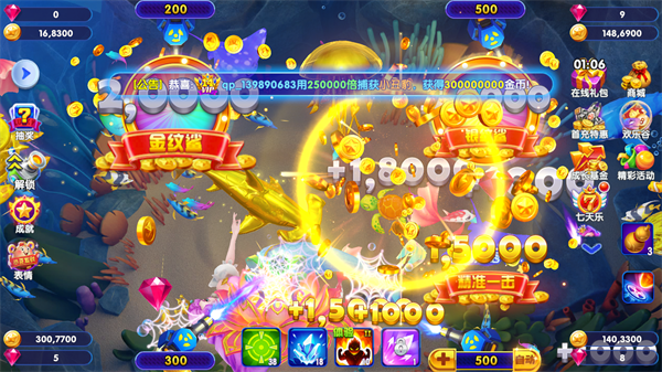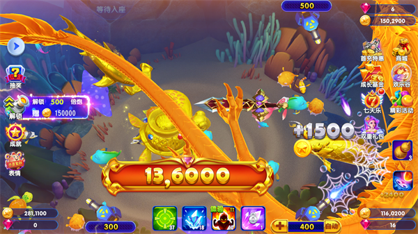 多场景渔场:设有多个主题渔场(如珊瑚海域、深海秘境、极光冰洋等),每张地图拥有独特的鱼群组合与BOSS挑战。