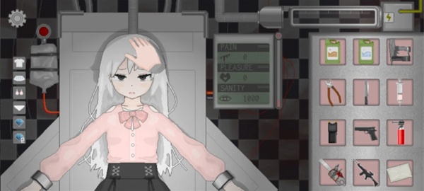 2、进入游戏核心场景,角色被固定在实验台上,右侧工具栏提供多种道具如钳子、枪械、注射器等,用于触发不同剧情分支与情绪反馈。
