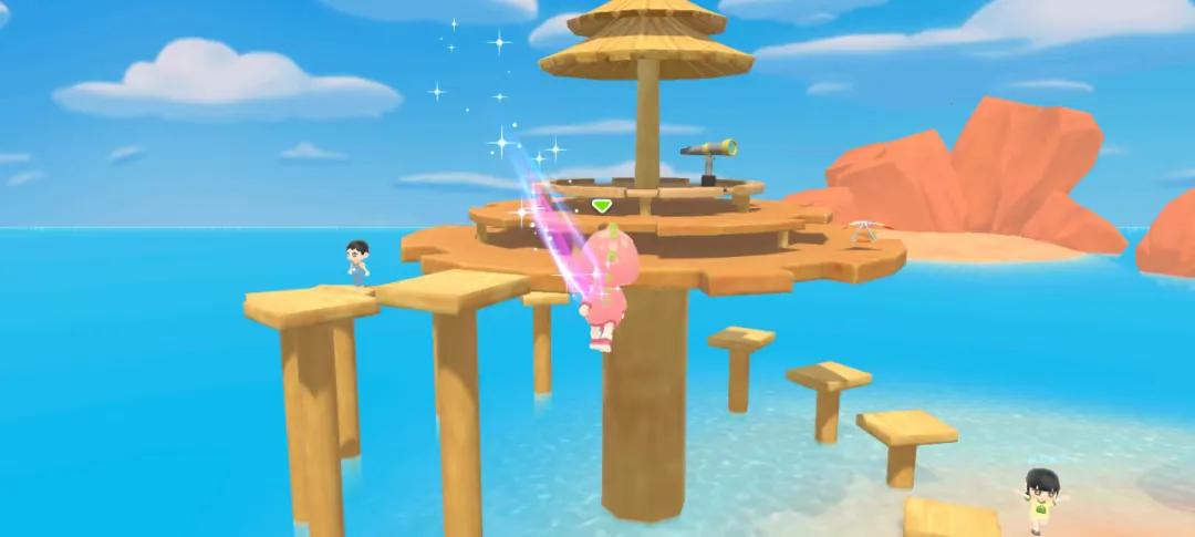 1.前往图中浪漫海岛,借助跳梅花桩的方式抵达观景台的顶部位置。