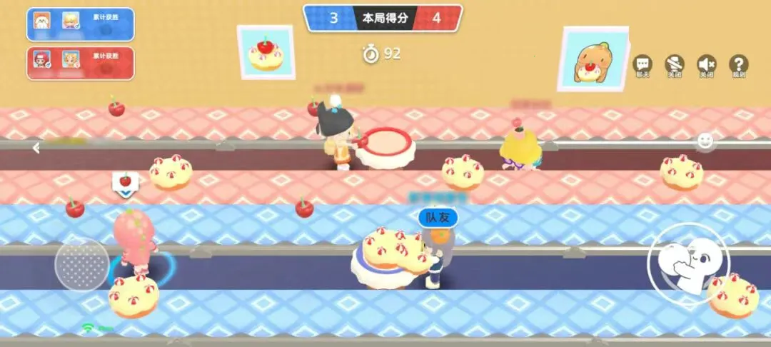3.准备阶段迅速确定负责物品,樱桃在上方传送带、蛋糕在下方,物品靠近时点击抱住送至中间桌,放蛋糕者可提前抱下一个等待。