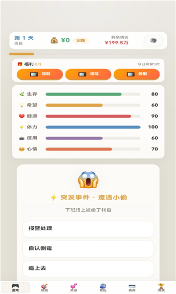 负产阶级不是一场轻松的逆袭爽局。38岁,失业边缘,负债200万,上有老下有小,信用在塌,身体在透支,希望也在一点点熄灭。没有系统没有外挂没有一夜暴富,只有打不完催收电话的账单,和必须撑下去的明天。白天上班,晚上兼职,凌晨算账,在体力健康心情希望信用与生存间艰难取舍,在债务协商技能成长关系维系和现实压力间反复拉扯。每一天不是怎么赢,而是怎么不倒下。这是普通人在夹缝里活下来的游戏,也许会被催收击垮,被病痛拖累,被生活磨平棱角,但也可能在深夜靠私活、家人鼓励、咬牙坚持重新把自己从泥里拽出来。债务可清零,真正要拯救的不只是数字,而是重压下仍不肯认输的自己