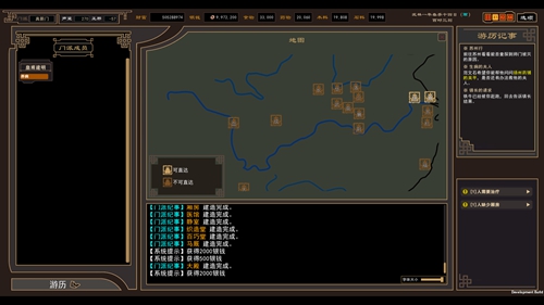 游戏的游历玩法以MUD类游戏为基础,构建一个开放的江湖。你可以摆脱主线剧情的限制,带领弟子在地图中自由探索。