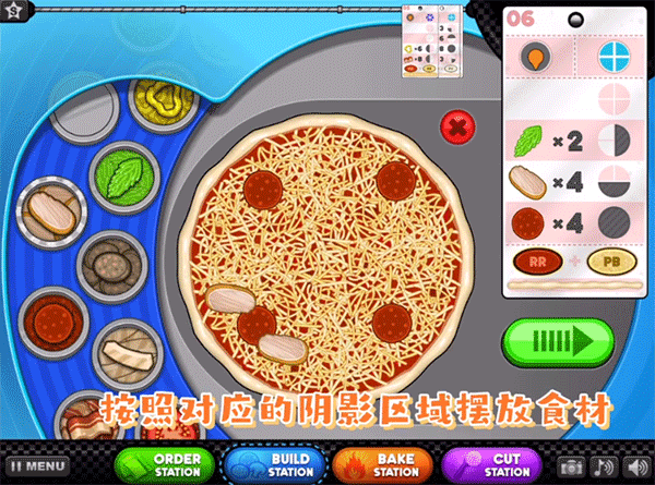 3、接着按照右图中对应的阴影区域摆放食材。(材料分配要平均)